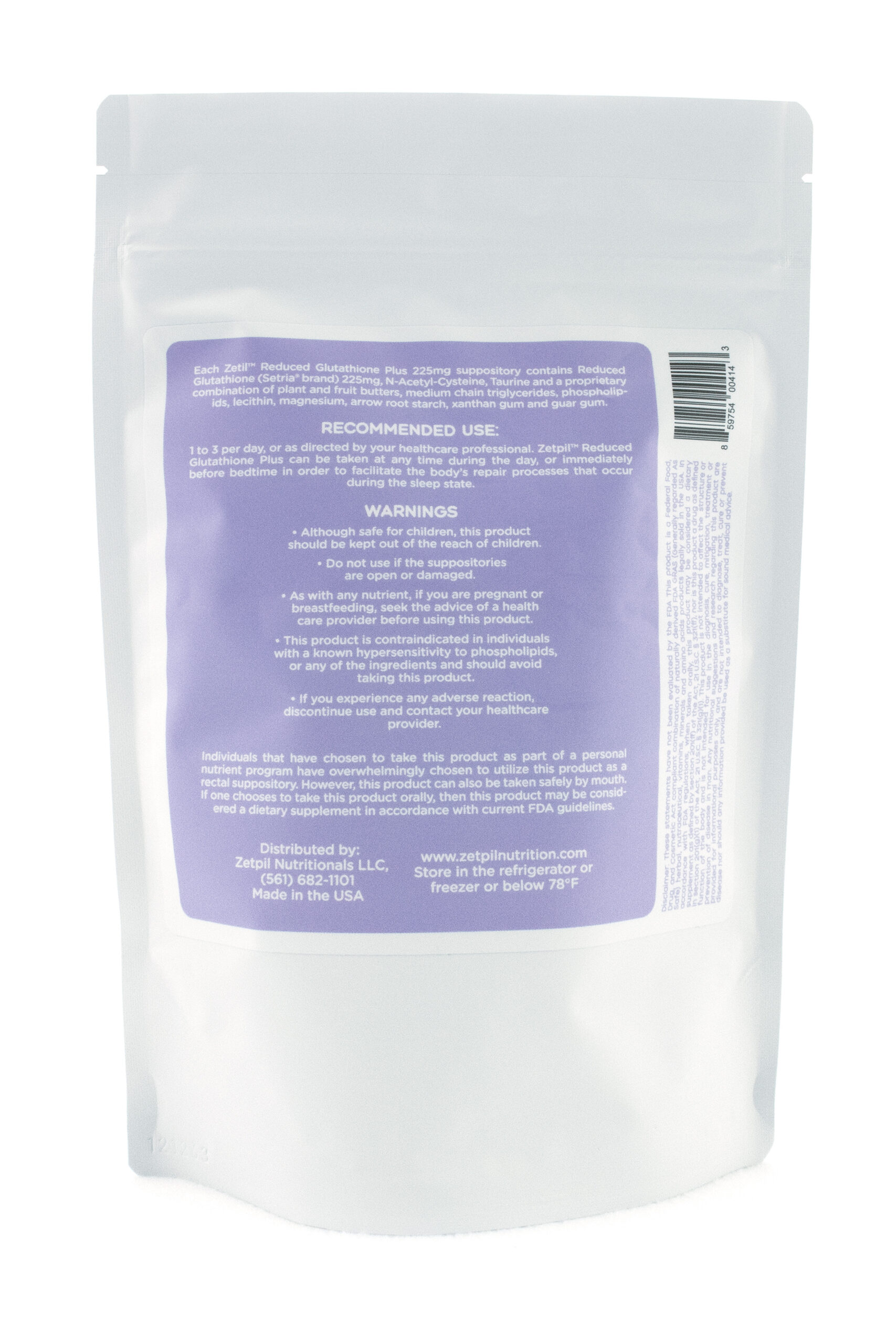 | Each Zetpil™ Reduced Glutathione Plus suppository contains Reduced Glutathione (Setria brand) 225mg, N-Acetyl-Cysteine, Taurine and a proprietary combination of plant and fruit butters, medium chain triglycerides, phospholipids, lecithin, magnesium, arrow root starch, xanthan gum and guar gum. | |