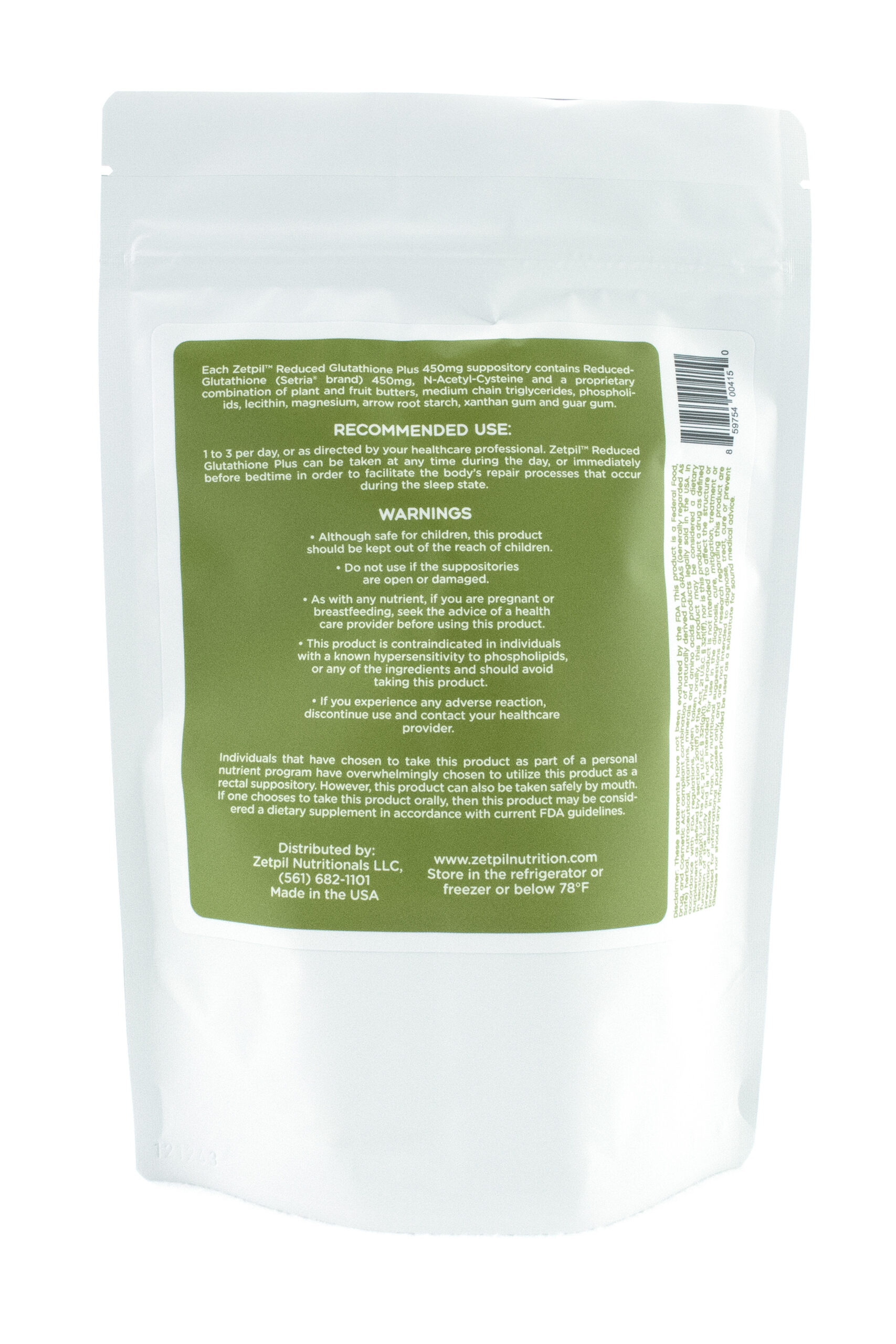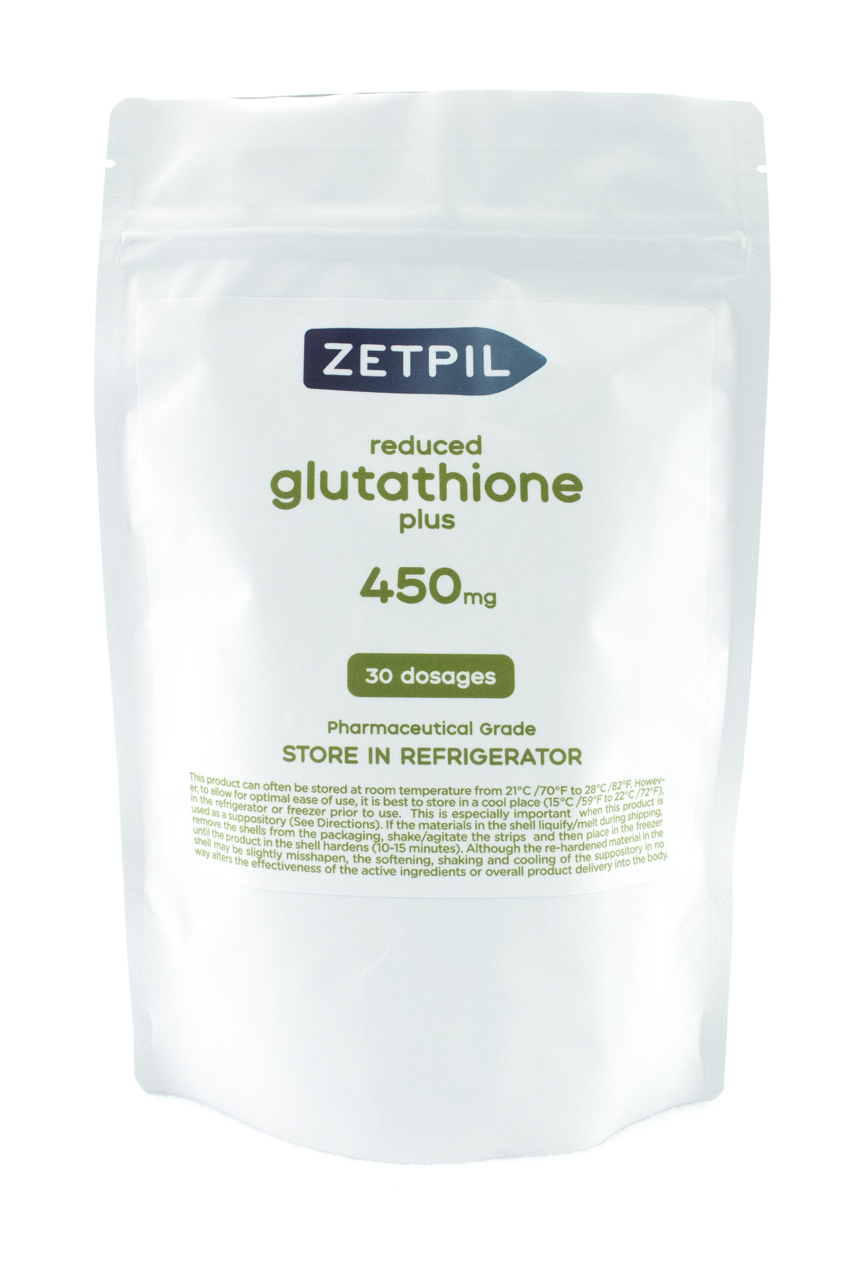 Considering the cost, side effects and inconvenience of I.V. Reduced Glutathione treatments, the Zetpil™ solution seems both practical, easy, and more effective long-term for your health care needs. Approximately 4 dosages of Zetpil™ 450mg suppositories is the equivalent of one (1) I.V. dose absorbed.